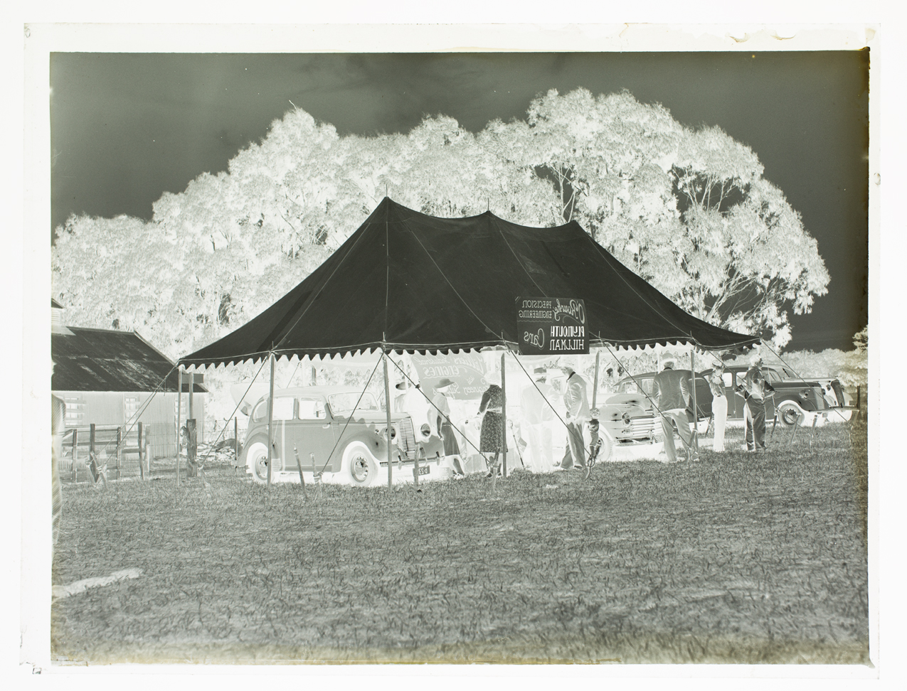 English: "O'Rourkey Precision Engineering Plymouth Hillman Cars" sign visible on stall. "Villiers Industrial Engines and Engineers Su(pplie)s" visible on a sign inside the stall. There are several people and automobiles underneath marquee. |