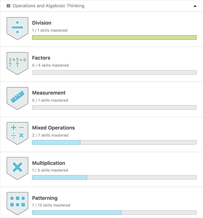 See the skills your child has worked on in each grade level, and find out how many skills they’ve mastered within each topic!