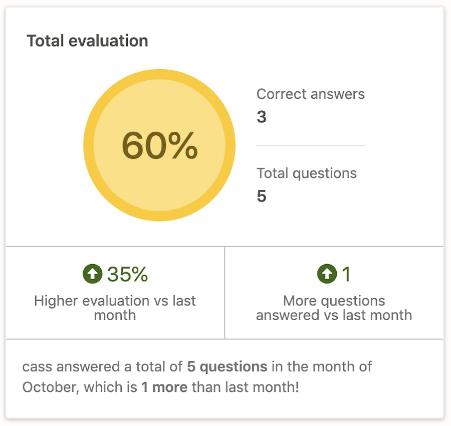 - Total evaluation — The percentage of total questions your child answered correctlyÂ