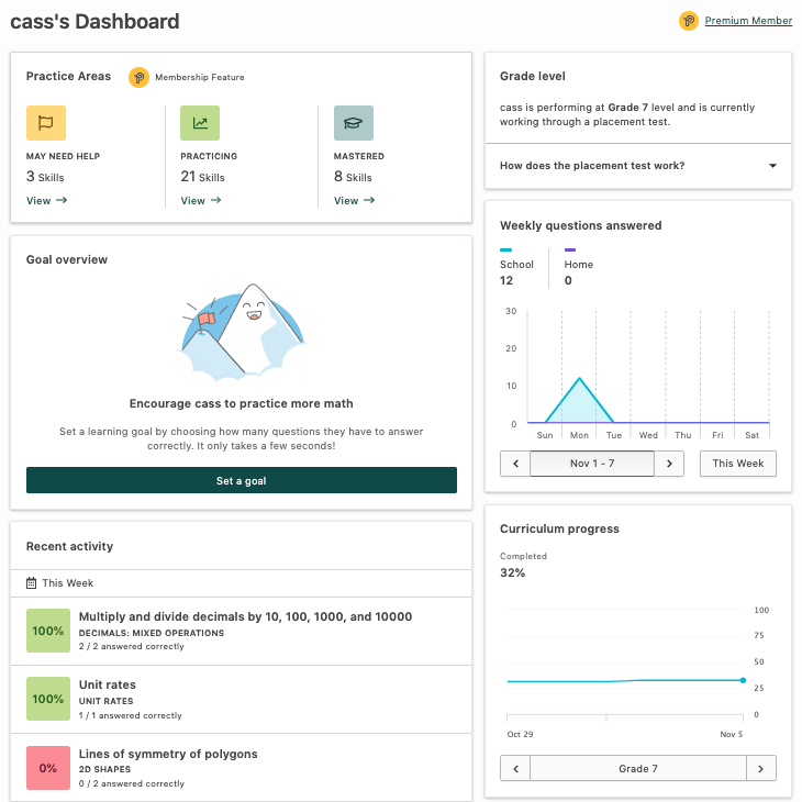 - Recent activity — See which topics your child has recently answered questions in, including the number of questions they answered correctly.Â